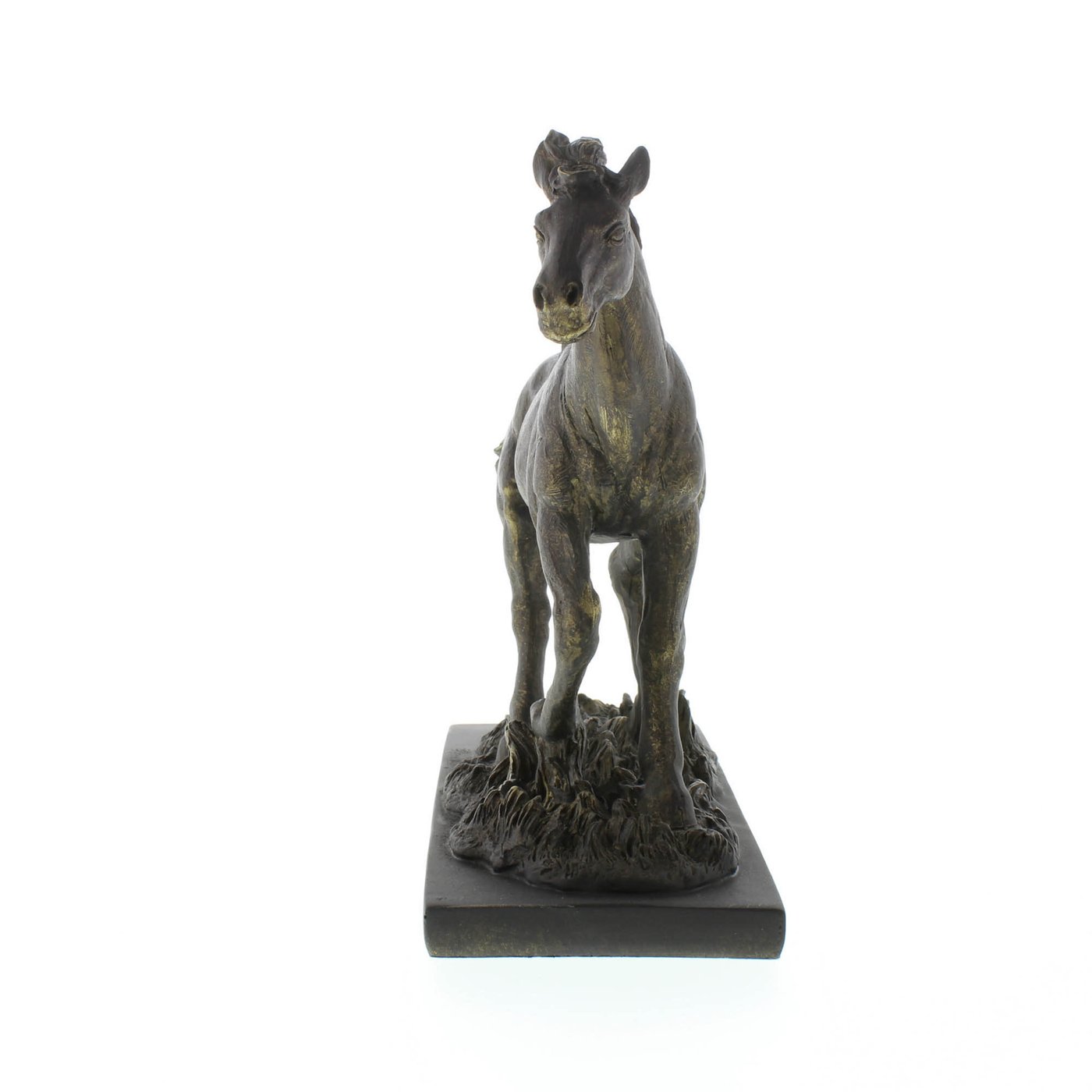 • There is nothing like the grace and strength of a running stallion. Captured in mid stride in a meadow, this bronze colored beauty will be perfect rustic addition in any room.