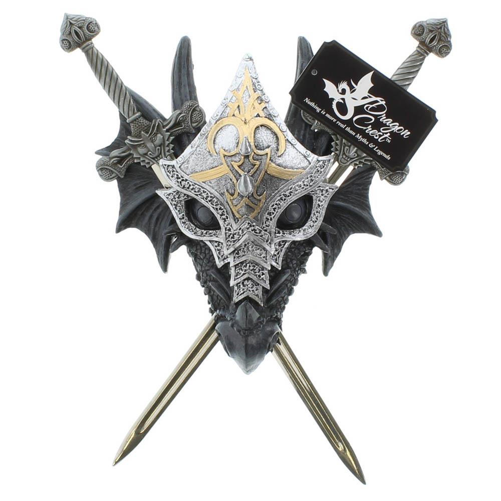• From beneath the hood of his intricate armor, a horned dragon inspires heartfelt fear with his malicious stare. Removable swords are a chillingly accurate miniature version of the mighty weapons wielded by history's fiercest warriors. (Decorative purposes only).