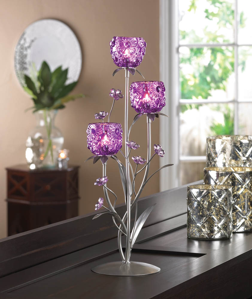 • This lovely candleholder features a silvery framework of leaves and stems that burst with bright fuchsia blooms. Three flower-pattern candle cups await the candles of your choice, surrounded by precious little glass flowers. Adds a warm, flickering glow to any room and makes an amazing housewarming gift.