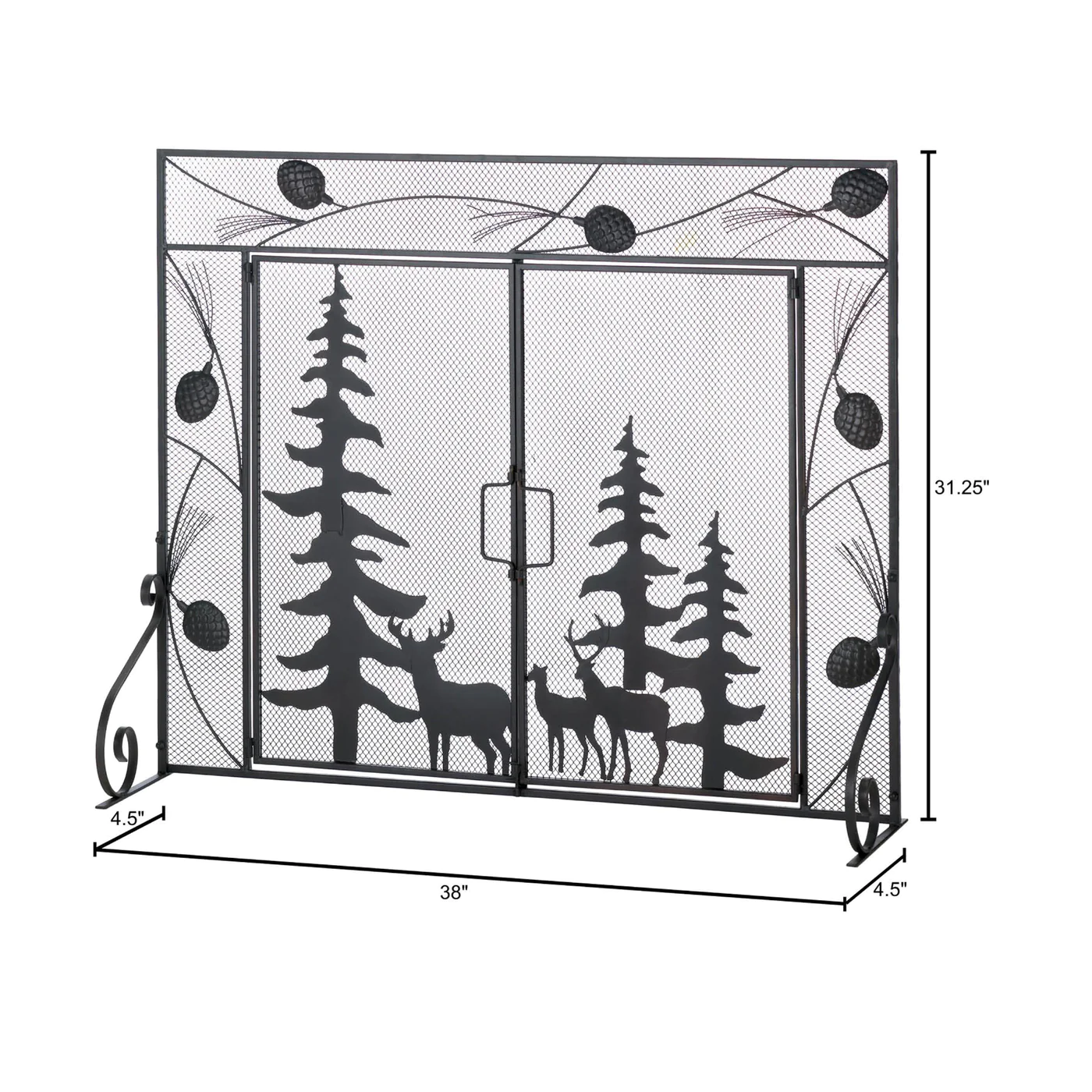 • A wonderful woodland scene is yours to enjoy every day when you place this gorgeous iron screen in front of your fireplace. Detailed pine cones surround the outer trim, while the interior panels feature silhouettes of evergreens and forest creatures. It’s the perfect way to frame the flickering flames inside your fireplace!