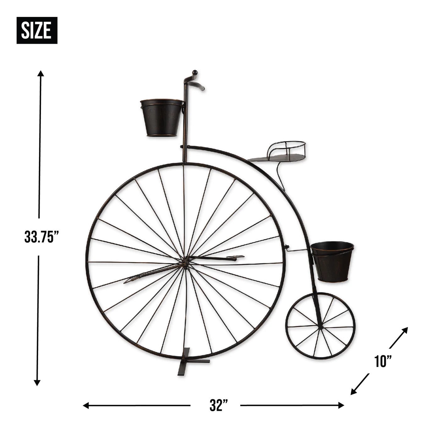 • This adorable planter's frame looks like a high-wheel bicycle from bygone days, with one large wheel in the front and a smaller wheel in back. Attached are three pails that are ready to hold your blooming plants. This lovely accessory will look great on your patio or in your favorite room.