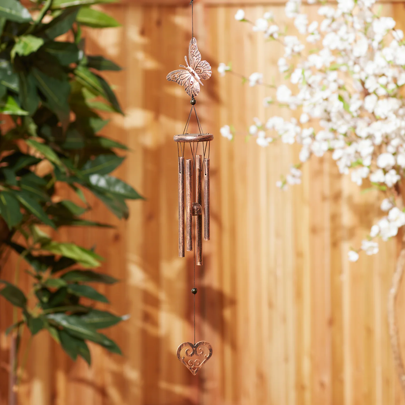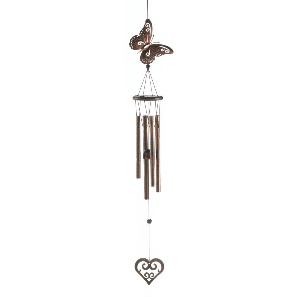 • This lovely wind chime will charm you, even when the breeze is still. It features a pretty butterfly on top and a decorative heart charm below. Hang it from your porch or patio and listen to the song of the wind!