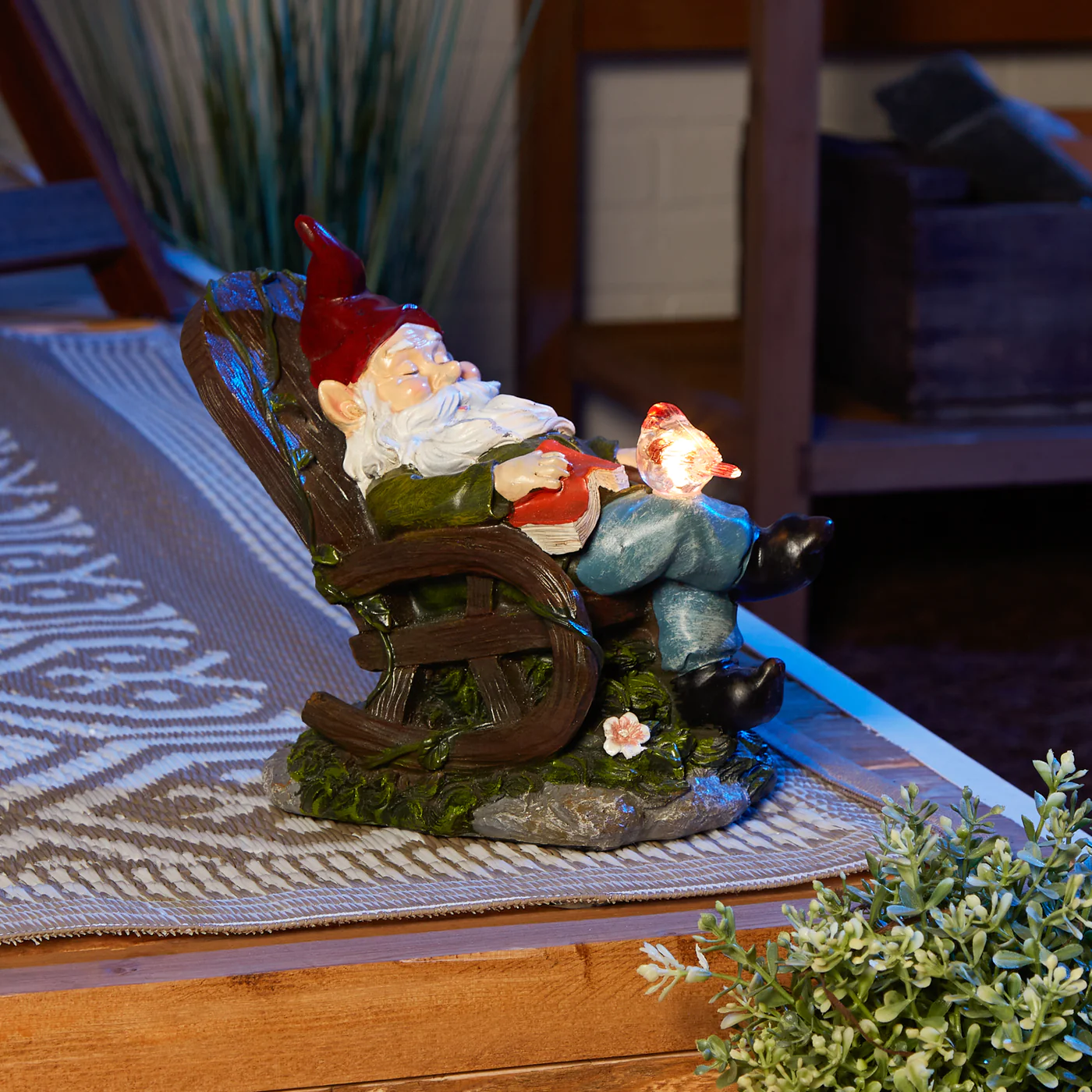 • This adorable outdoor statue features a sleepy gnome with his favorite book, taking a quick nap in his favorite rocking chair. The red bird on his knee lights up at night after soaking up the sun's rays all day.