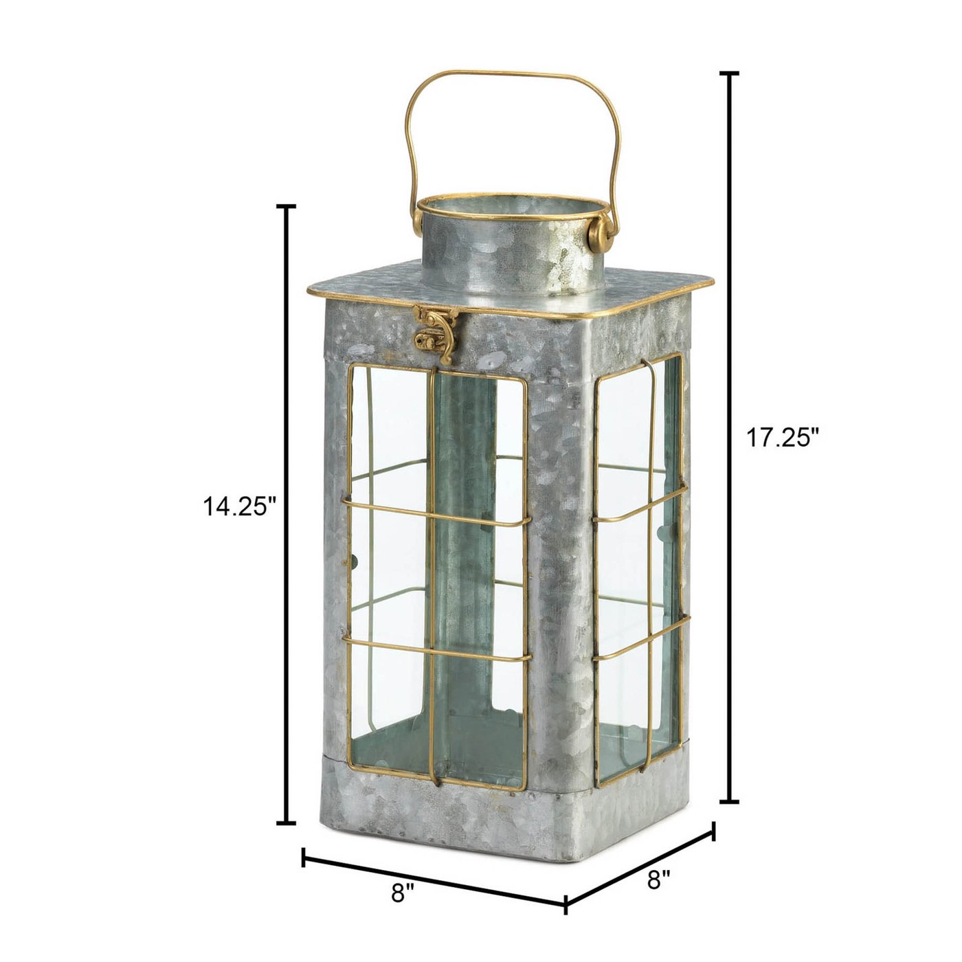 • Rustic galvanized lantern weighs 3.4 lbs. and measures 8 inches by 8 inches by 14.25 inches. The perfect accent to a farmhouse chic aesthetic!