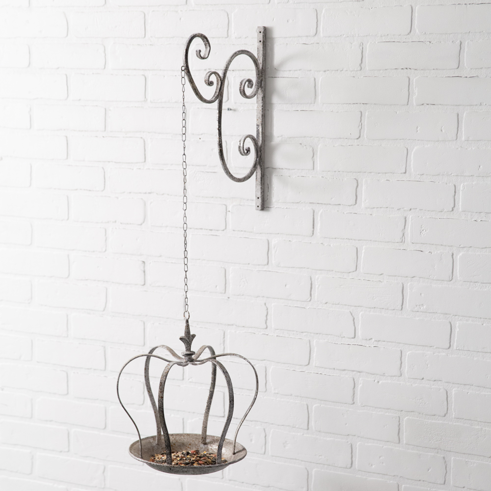 Welcome your feathery friends with regality by displaying our Hanging Crown Feeder outdoors. This item is crafted from metal and is one connected piece. The crown measures 12¼''H. To hang, use its four screw holes.
