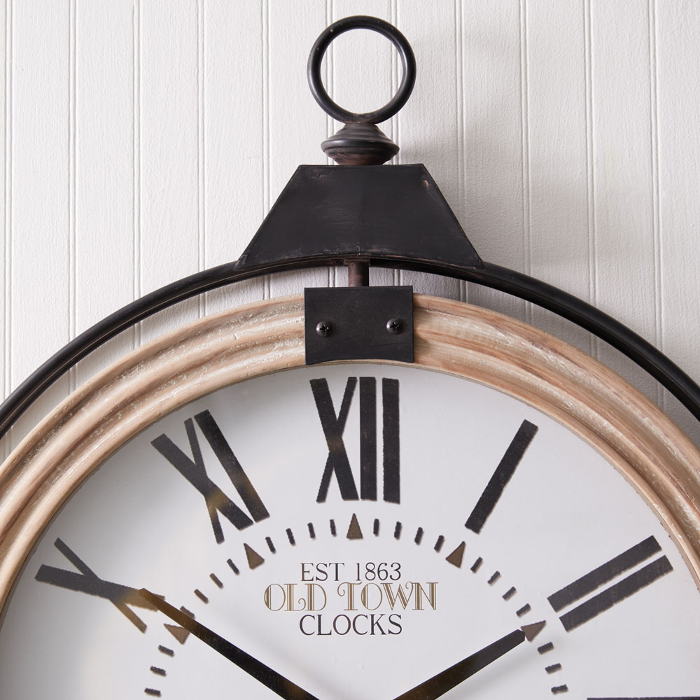 Bring forth an old world touch with this pocket watch style clock. Roman numerals adorn its center while it is framed with metal and wood. To hang, use its keyhole hanger. Requires an AA battery, not included.